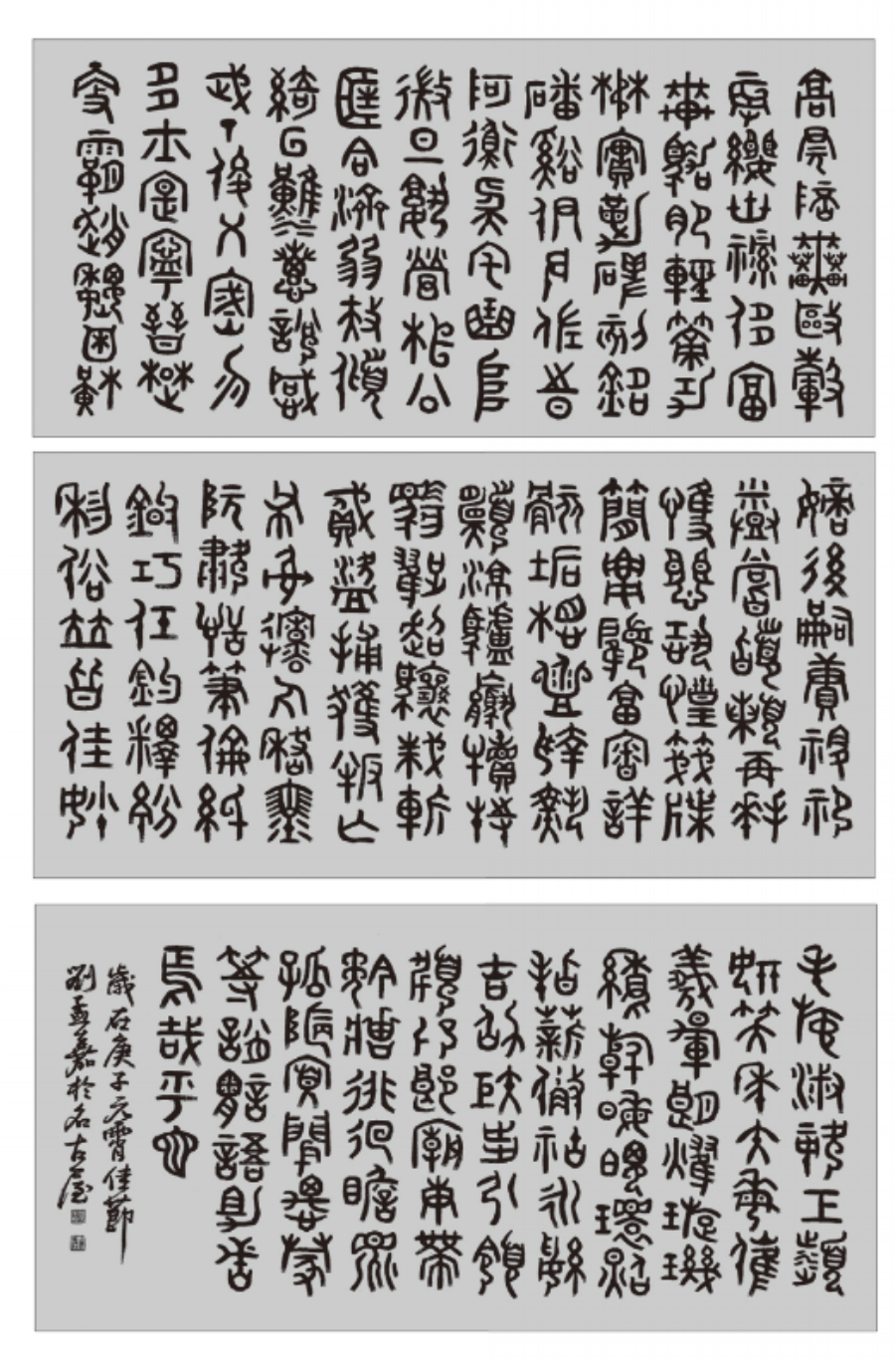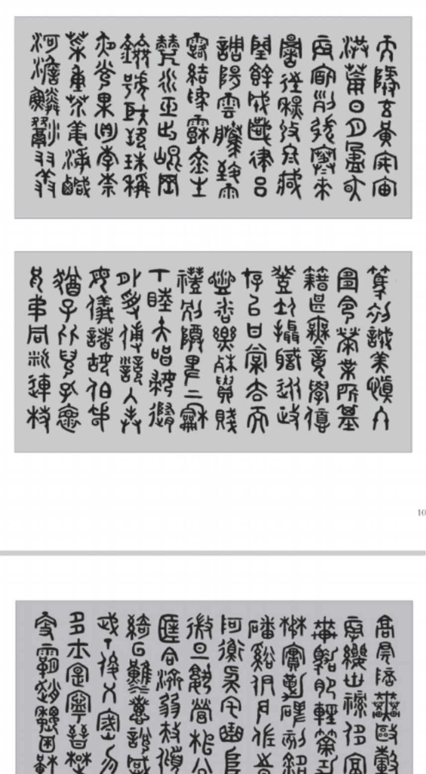 刘孟嘉教授认为每个字都是随章法而变化的个体,所以本书的每一个字、每一个笔画都是和整体章法密切相关的,达到了变一个字笔画的长短和粗细都不可的地步。正如中国书法家协会原副主席张业法在序言中所说:“本书千字文是一千个不同的篆字,约占出土金文字的一半,可以说本著作的出版必将对我国书法艺术水平的提高和传统文化的学习是一次推进,此著作也是书法爱好者和篆刻者们的必备之书。”(本文作者系民盟山东省委委员、文史委主任,书法家、作家)